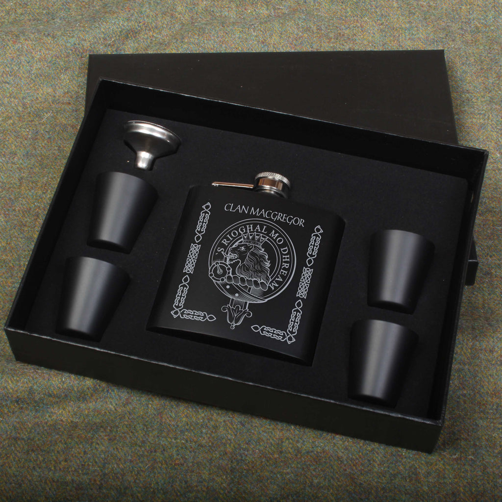 MacGregor Clan Crest engraved 6oz Matt Black Hip Flask Gift Set with Cups and Funnel
