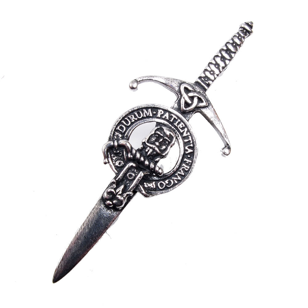 Elevate your Scottish attire with our Clan Crest Pewter Kilt Pin featuring the prestigious Muir Crest. This beautiful kilt pin is designed in a broadsword style, combining traditional craftsmanship with a modern touch. The antique palladium finish adds a classic elegance that makes it a perfect accessory for any kilt, whether for weddings, clan gatherings, or everyday wear.