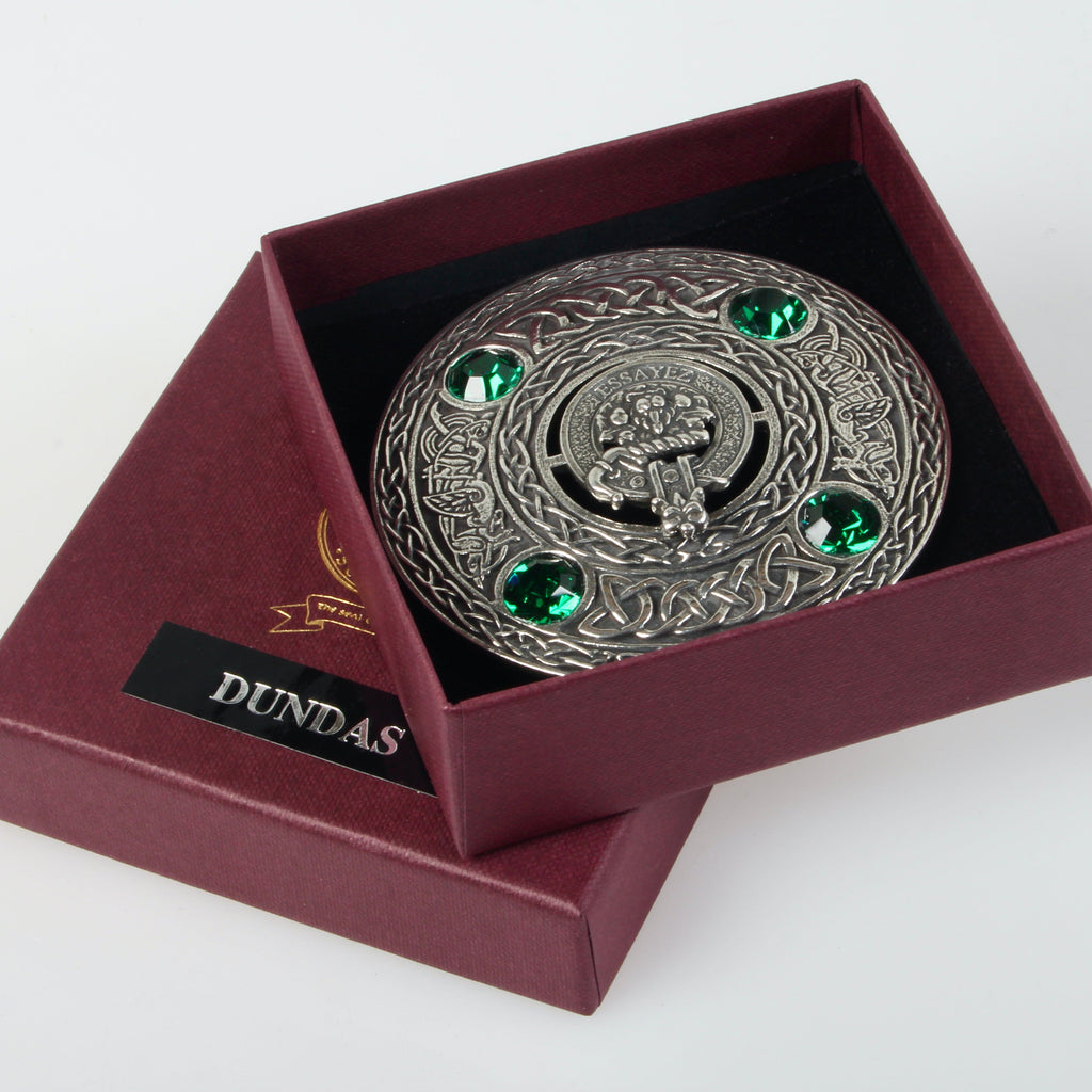 These clan crest plaid brooches are made from pewter and each crest is approved by the Standing Council of Scottish Chiefs. The brooch has a characteristically Celtic design around the crest, as well as four coloured stones.