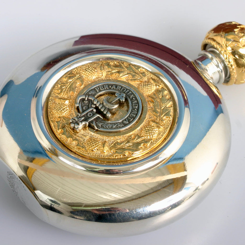 6oz sporran flask with gold plated thistle design insert around the clan crest of your choice. Made from pewter - a material used in Scotland for centuries.